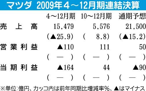 マツダが5日、東京都千代田区の丸の内マイプラザで開いた2009年4~12月期連結決算会見における主な質疑応答は次の通り。 ―業績は底入れし、また来期も上昇基調が続くのか 山内孝社長兼CEO(最高経営責任者)「第3、第4四半期の稼働率は82...