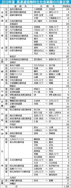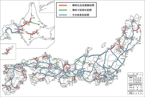 国土交通省は、高速道路無料化の社会実験計画(案)をまとめた。計画によると、全国の高速道路や自動車専用道路など37路線の50区間、1626キロメートルで実施する。首都高速道路と阪神高速道路、大都市圏及び県庁所在地を結ぶ路線は除外した。これら...