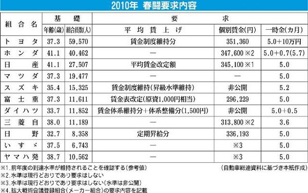 自動車メーカー各社の労働組合が17日、2010年春闘の要求を経営側に一斉提出した。全11組合のうち9組合が賃金改善分の要求を見送り、賃金カーブ維持分の確保に集中する。富士重工業、ダイハツ工業が業績改善への貢献、賃金体系整備などを根拠に実質...
