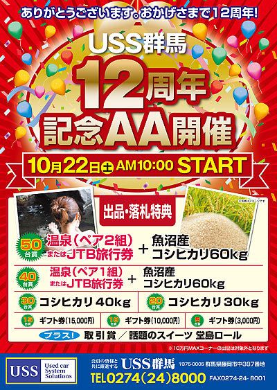 【前橋】USS関越(新井栄一社長)は、10月22日にUSS群馬会場で「開場12周年記念オークション(AA)」を実施する。好調な成約率を背景に、特産ブランド米などの豪華な参加特典を盛り込むことで大型企画に花を添える計画だ。今回のAAでは魚沼...