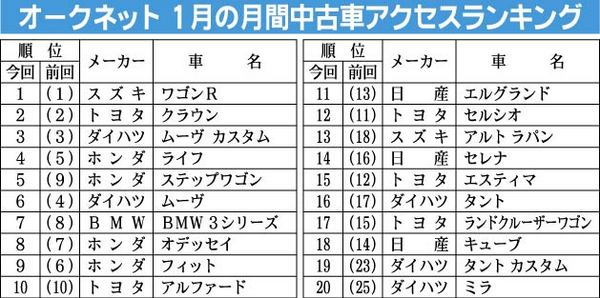 オークネット、1月中古車検索月間アクセスランキング発表 上位3車種が根強い人気