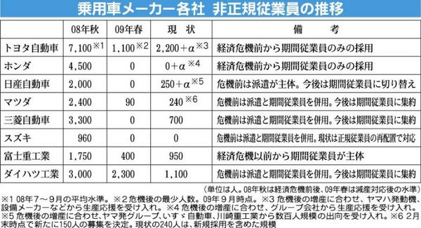 自動車メーカーや部品メーカー各社で、非正規従業員の採用を増やす動きが緩やかに続いている。2009年夏にトヨタ自動車や三菱自動車などが期間従業員の雇用を再開して以降、同様の動きが各社にじわりと拡大。09年春に乗用車8社で4千人弱人だった採用...