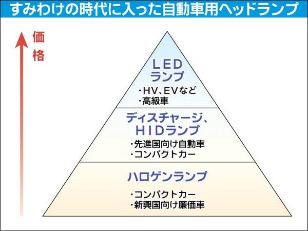 第4のあかりといわれるLED(発光ダイオード)。自動車用ヘッドランプにも登場し、省エネルギー性や耐久性、斬新なデザイン性から次世代型ヘッドランプとして注目を集めている。 第4世代のあかりとは、家電業界によるとろうそくやガス灯などが第1世代...