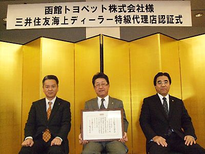 【函館】函館トヨペット(河村隆平社長)は、三井住友海上火災保険のディーラー特級代理店認定を受けた。保険募集の品質向上に取り組み、各種指標を改善した。 認定証授与式は市内のホテルで行われた。河村社長と秋田昭司常務、川北孝執行役員が出席した。...