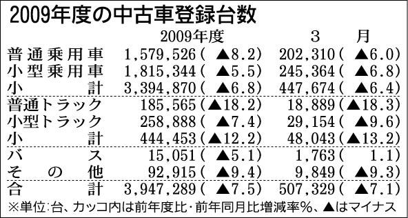 日本自動車販売協会連合会(自販連、天野洋一会長)が12日発表した2009年度の中古車登録台数は、4年連続マイナスの前年同期比7・5%減の394万7289台で、1978年の調査開始以来初の400万台割れとなった。 車種別では乗用車が同6・8...