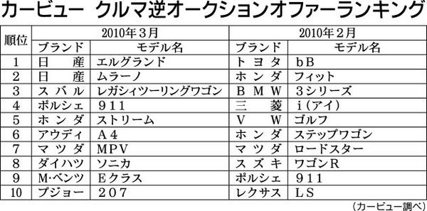 カービューは、ユーザーが購入を希望する車両を複数の中古車販売事業者が検索するインターネットサービス「クルマ逆オークション」の3月の車種別申し込みランキングをまとめた。 それによると3月のランキングは、ゴールデンウイークや行楽シーズンを控え...