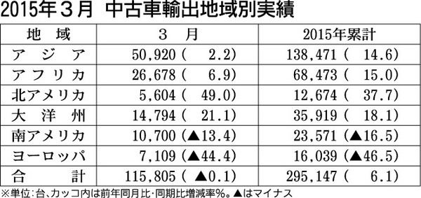 日本中古車輸出業協同組合(中輸協、佐藤博理事長)がまとめた3月の中古車輸出台数は、前年同月比0・1%減の11万5805台だった。前年割れは2012年12月以来27カ月ぶり。ロシア向けが依然として低調なほか、これまで仕向け地別でトップミャン...