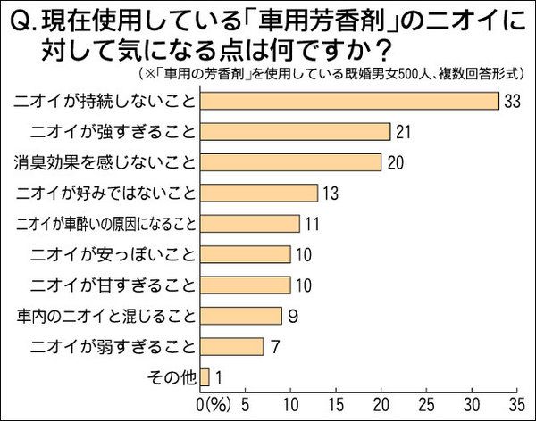 エステーは、夫婦共有の車で「車用芳香剤」を使用している既婚男女に「車のニオイケア」に関する調査を実施し結果発表した。これによると、全体の73%の人が現在使用している車用芳香剤に気になる点があるにもかかわらず使っていると回答した。 車用芳香...
