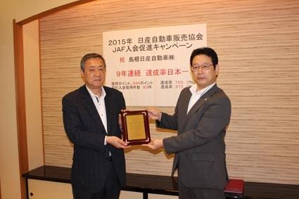 【松江】島根日産(櫻井誠己社長)が、日産自動車販売協会の「JAF入会促進キャンペーン」で目標達成率で全国トップになった。同社が全国トップになるのは今年を含め9年連続。その偉業を称え7日、松江市内で祝賀会が開かれた。 同キャンペーンは日産販...