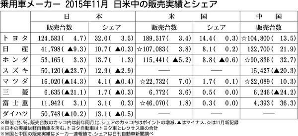 日本の乗用車メーカーによる2015年11月の日本、米国、中国市場における販売台数がまとまった。国内はトヨタ自動車、ホンダ、富士重工業が前年実績を上回った。米国市場は日産自動車、マツダ、富士重が11月として過去最高。中国ではトヨタ、ホンダ、...