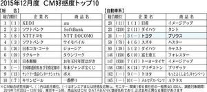 CM総合研究所(関根心太郎代表、東京都港区)は2015年12月度のCM好感度ランキングをまとめた。総合の上位は通信3社が占めた。KDDI「au」の首位は13カ月連続となった。年賀はがきやジャンボ宝くじがいかにも年末らしい。自動車関連では日産「イメージアップ」が首位をキープし総合20位。ダイハツ「タント」とトヨタ「プリウス」がこれに続いた。この調査…