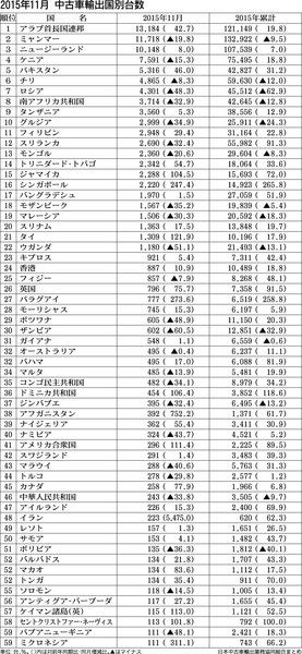 日本中古車輸出業協同組合(中輸協、佐藤博理事長)は、2015年11月の仕向け国・地域別の中古車輸出台数を発表した。アラブ首長国連邦(UAE)が2カ月ぶりに首位となった。2位に後退したミャンマーは、先月よりも減少幅が大きくなり7カ月連続でマイナスが続いている。トリニダード・トバコに代表されるカリブ海諸国向けの輸出は好調に推移した。暦年(1~12月)…