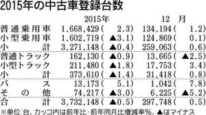 日本自動車販売協会連合会(自販連)が15日発表した2015年の中古車登録台数は、前年比0・5%減の373万2148台となり、2年連続で過去最低を更新した。14年は消費増税の影響が大きかったが、15年はそれをさらに下回った。自販連は「中古車に関して、台数がプラスになる要因がない」と話し、16年もさらに市場環境は厳しくなると予測した。車種別では、乗用…