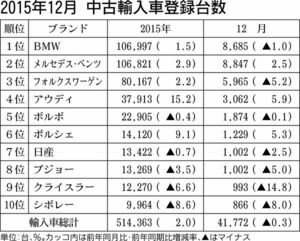 日本自動車輸入組合(JAIA)が発表した2015年の中古輸入車登録台数は、前年比2・0%増の51万4363台で、2年ぶりにプラスとなった。ブランド別では、BMWが前年比1・5%増の10万6997台で、5年連続でプラスとなった。2位はメルセデス・ベンツで、2・9%増の10万6821台、3位はフォルクスワーゲン(VW)で2・2%増の8万167台だった…