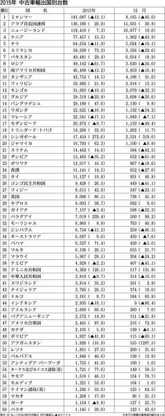 日本中古車輸出業協同組合(中輸協、佐藤博理事長)が発表した2015年の中古車国・地域別輸出台数によると、ミャンマーが2年連続で首位となった。台数は前年比12・1%減の14万1487台。14年に2位だったロシアは、経済不振や通貨ルーブルの下落で61・7%減と大幅に減少し8位に沈んだ。2位UAE(20・9%増)や3位ニュージーランド(7・3%増)は、…