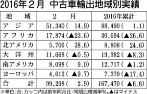 日本中古車輸出業協同組合(中輸協、佐藤博理事長)がまとめた2月の中古車輸出台数は、前年同月比2・9%増の9万9298台で、2015年8月以来6カ月ぶりに前年を上回った。中国経済の低迷で15年9月から不振が続いていたが昨年2月は好調が続いていた期間でもあり、中古車輸出市場の復調の兆しがうかがえる結果となった。主力地域であるアジアは14・9%増の5万…