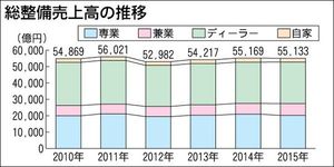 日本自動車整備振興会連合会(日整連、橋本一豊会長)が自動車整備白書2015年度版を公表した。総整備売上高は前年度比0・1%減の5兆5133億円と3年ぶりに減少したものの、ほぼ横ばいで推移している。新車販売台数や継続車検台数の低迷など経営環境が悪化する中、車検や定期点検などの分野で売上高を着実に積み上げる。低迷する事故整備売上に代わる新たな収益源の…