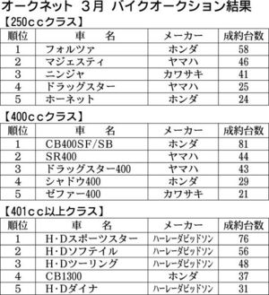 中古車テレビオークションのオークネット(藤崎清孝社長、東京都港区)は14日、3月のバイクオークション結果を集計し、成約排気量別ランキングを発表した。250ccクラスがホンダ「フォルツァ」、400ccクラスがホンダ「CB400SF/SB」、401cc以上クラスではハーレーダビットソン「H・Dスポーツスター」が1位だった。401cc以上クラスではハー…