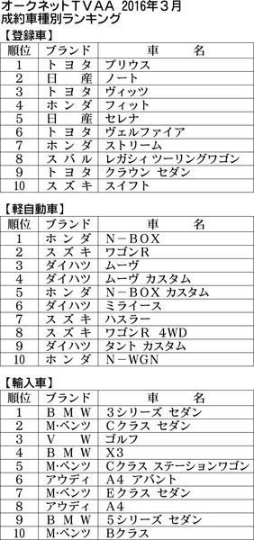 オークネット(藤崎清孝社長、東京都港区)は、3月の中古車テレビオークションの結果を集計し、成約車種別ランキングを発表した。登録車の1位は、2カ月連続でトヨタ自動車の「プリウス」だった。2位には6カ月ぶりに、日産自動車の「ノート」が上位10車種に入った。軽自動車では、ホンダの「N―BOX(エヌボックス)」が1位で、輸入車では、3カ月連続でBMWの「…