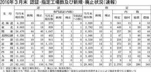 国土交通省は2016年3月末時点の認証・指定工場数と新規・廃止状況をまとめた。認証工場数は前月比5件減の9万2165件で、2カ月ぶりに減少した。指定工場数は31件増の2万9865件となり、10カ月連続で増加している。専門認証工場数は21件増の6780件で32カ月連続で増加となった。前年同月で比べると、認証工場数が84件減、指定工場数が116件増、…