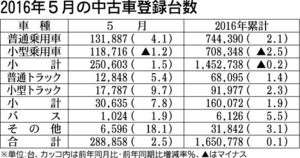 日本自動車販売協会連合会(自販連)が10日発表した2016年5月の中古車登録台数は、前年同月比2・5%増の28万8858台で2カ月ぶりに増加した。「4月の新車販売台数増に伴う下取車の商品化や業者間販売増が登録につながった」(自販連)とみている。ただ、消費マインドの低迷や慢性的なタマ不足は続いており「今後の状況は読みにくい」(同)という。車種別では…