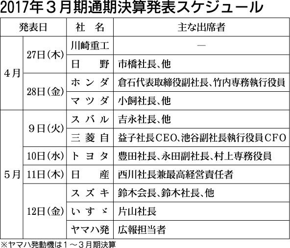27日からメーカーの2017年3月期決算の発表が始まる。前年度に比べ円高ドル安で推移した16年度はスバルを除く8社が減収、ホンダとスズキを除く7社が営業減益を予想している。17年度は為替がどう影響するのか。競争が激しさを増している米市場の...
