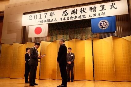 日本自動車連盟(JAF)大阪支部(白土貴久支部長)は25日、大阪市内のホテルで2017年感謝の会」を開催した。昨年、会員獲得で好実績を残した新車ディーラーや取扱店などの35法人と、営業スタッフなどの40人を表彰した。全国2位につけた日産大...