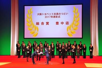 大阪トヨペット(横山昭一郎社長)は5日、大阪市内で「社員のつどい(2017年表彰式)」を開催した。昨年に優秀な成績を収めた店舗と従業員延べ357人を表彰し、最高の栄誉とされる総合賞には豊中店(葭井貴之店長)が輝いた。 式典には来賓としてト...