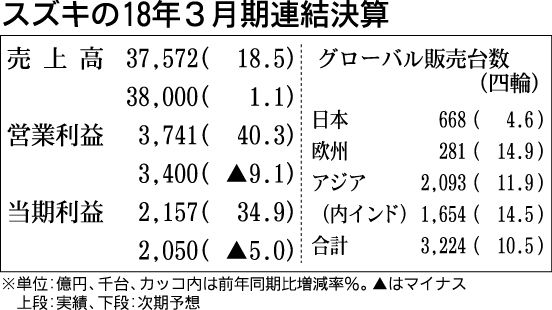 スズキは10日、2019年3月期の営業利益が前期比9・1%減の3400億円となる見通しを発表した。営業減益は4期ぶり。為替や研究開発費の増加がマイナス要因となる。一方、売上高は2期連続で過去最高を見込み、四輪車の世界販売も同2・3%増の3...