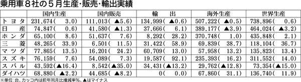 乗用車メーカー8社は28日、2018年5月の生産・輸出実績を発表した。8社合計の世界生産は、前年同月比3・7%増の241万4341台と2カ月連続で増加した。日産自動車とスバルを除く6社が前年を上回り、ホンダ、マツダ、スズキ、ダイハツ工業が...