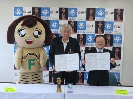 【舟形】日本自動車連盟(JAF)山形支部(鈴木寿昭支部長)は20日、舟形町と「観光振興に関する協定」を締結した。同日、舟形町役場で締結式を行い、鈴木支部長と舟形町の森富広町長が出席して署名した。 JAF山形支部が同協定を締結するのは、山形...