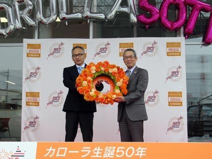 ○…全国のトヨタカローラ店をめぐる“花冠”が31日、トヨタカローラ山梨(木越賢治社長)に到着した。カローラ発売50年を記念した「笑顔の花冠プロジェクト」の一環で、カローラの語源である花冠のリースがバトン代わり。トヨタカローラ横浜(秋山豊社...