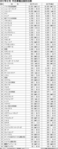 日本中古車輸出業協同組合(中輸協、佐藤博理事長)は2月の国別中古車輸出実績をまとめた。首位は5カ月連続でアラブ首長国連邦(UAE)となった。2位はニュージーランド、3位にはミャンマーが次いだ。 上位国ではニュージーランドが好調に推移する一...