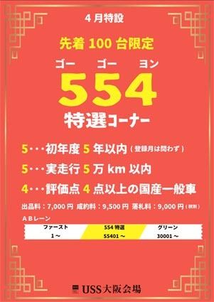 ユー・エス・エス(USS)が運営するUSS大阪(池田浩照会場長、大阪市西淀川区)は、4月に高年式を集約した特設コーナー「554特選コーナー」を設ける。初度登録から5年以内、走行距離5万キロメートル以内、評価点4点以上を条件とした車を集め、...