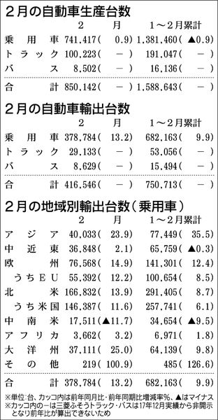 日本自動車工業会(西川廣人会長)がまとめた2月の国内生産台数は、乗用車の生産が前年同月比0・9%増の74万1417台と2カ月ぶりに増加した。小型車と軽自動車は減少したが、普通車が輸出向けの好調により増加した。 普通乗用車は前年同月比11・...