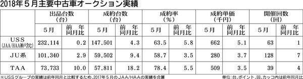 5月の主要中古車オークション(AA)実績のうち出品台数は前年同月比2・5%増の約40万7千台となった。中古車の登録台数、新車登録台数ともに前年同月比を下回ったが、AAへの出品台数は増えた。対象会社は、ユー・エス・エス(USS、JAAとHA...