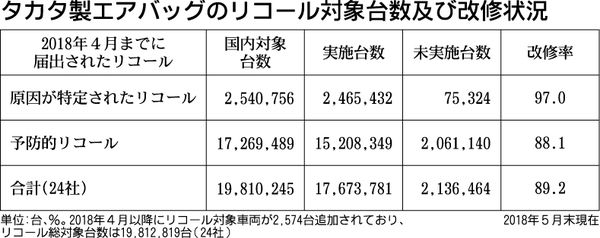国土交通省は、タカタ製エアバッグの改修状況を公表した。5月末時点での改修率は89・2%。原因が特定されたリコールに限ると改修率は97・0%に高まった。4月以降に2574台のリコールが追加され、総対象台数は延べ1981万2819台になった。...