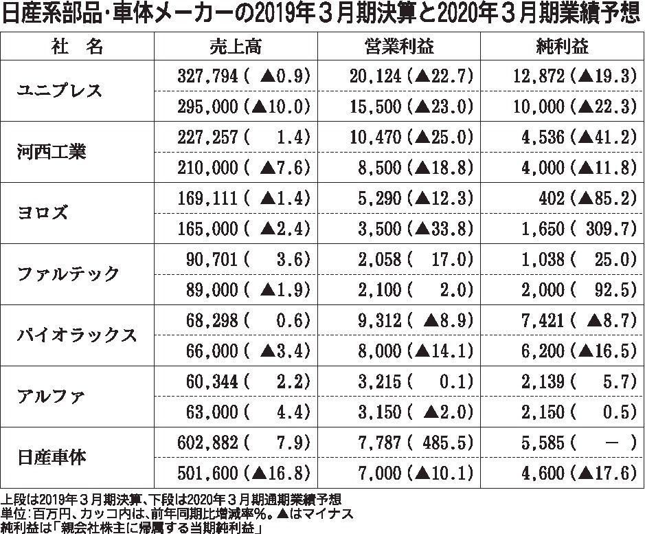 日産自動車と取引が多い部品メーカー主要7社の2019年3月期決算は、7社合計の売上高が前年同期比1・1%増、営業利益は同7・3%減で増収減益だった。日産の減産や為替影響、北米市場での労務費高騰、米中貿易摩擦に起因する昨年末からの中国経済の...