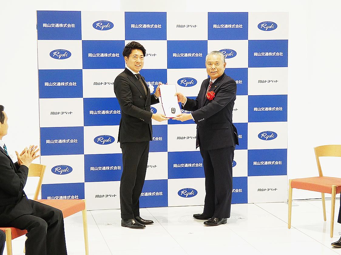 【岡山】岡山トヨペット(末長一範社長)は14日、岡山市中区の新車拠点「Hi Touch東岡山」で新型車「グランエース」の「県内第1号車納車式」を開催した=写真。納入先となる岡山交通の土江富雄社長ら関係者を招き、キー授与式を行った。 末長社...