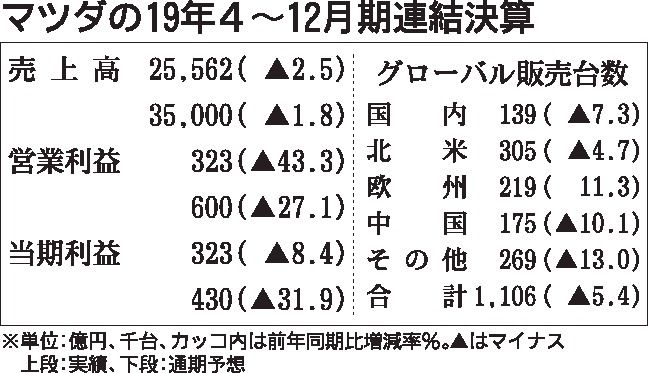 マツダが5日発表した2019年4~12月期の連結業績は、販売台数の減少や為替の影響により減収減益となった。営業利益は販売費用の抑制やコスト改善などの押し上げ効果はあったが、為替変動で4割以上減少した。通期の販売台数は昨年11月の公表時より...
