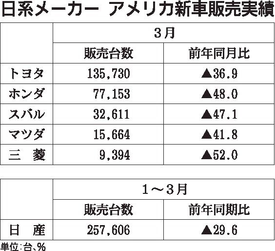 日系自動車メーカー6社の3月の米国販売台数が2日までに出そろった。新型コロナウイルスの感染拡大に伴う需要減の影響で、トヨタ自動車、ホンダ、スバル、マツダ、三菱自動車が前年実績を下回った。5社の合計台数は27万552台で、前年同月と比べて4...