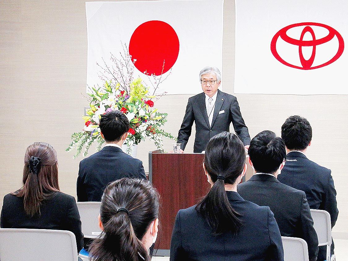 【甲府】山梨トヨタ(佐々木宏明社長)は1日、本社で入社式を開催した=写真。採用は前年同様11人(営業職3、エンジニア職5、事務3)で、佐々木社長をはじめ役員が歓迎の言葉を述べた。今年は新型コロナウイルス感染予防のためマスク着用で行い、役員...