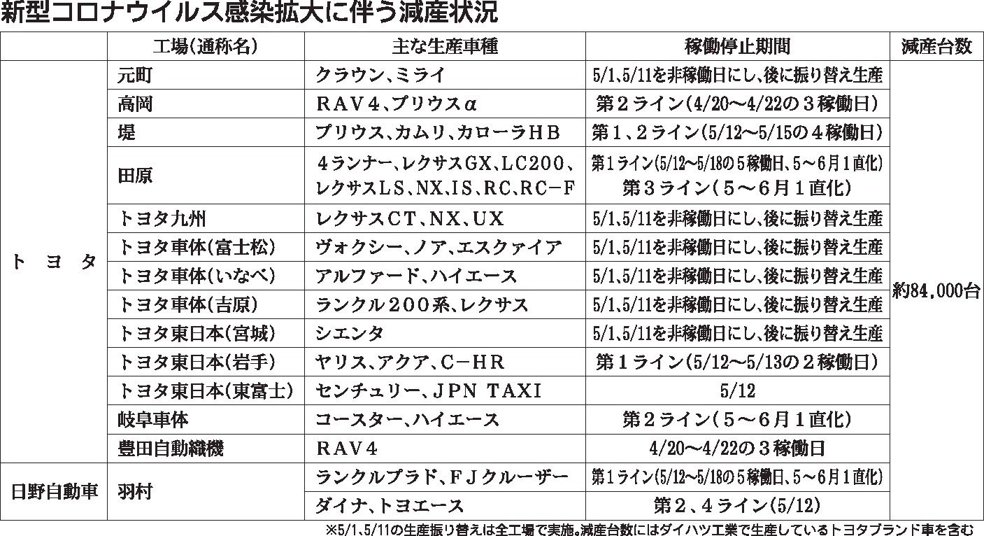 トヨタ自動車は、新型コロナウイルスの感染拡大による世界的な需要減少を踏まえ、5月以降も国内で生産調整を続けると発表した。5月は完成車全工場で2日間の稼働日振り替えを行うなどし、減産幅は約7万9千台と4月(約3万6千台)の2倍強になる。一部...