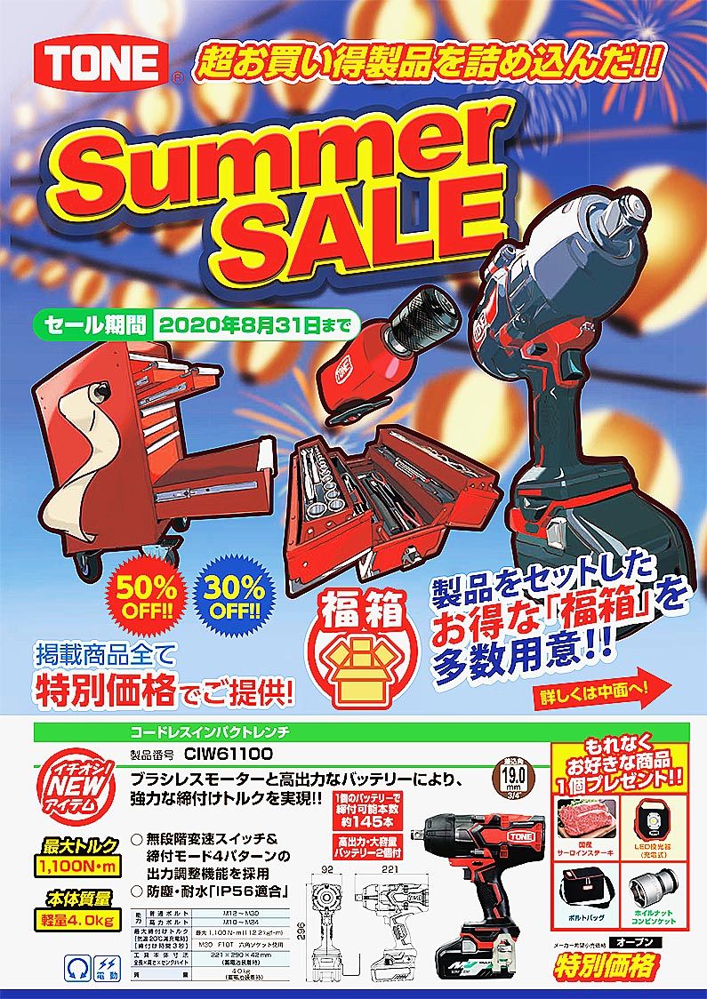 自動車用整備工具などを開発・販売するTONEは、8月31日まで「サマーキャンペーン」=写真=を実施している。期間中、対象製品の価格を最大で50%オフとするなど数量限定の特別価格で提供するほか、複数の製品をセットにした「福箱」も多数用意した...