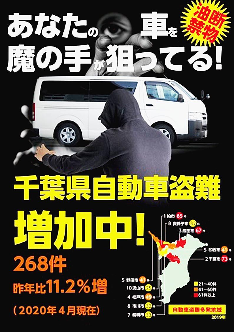 千葉県自動車盗難等防止対策協議会は、千葉県警や千葉県と共同で自動車盗難防止を啓発するチラシとポスター=写真=を作成した。県内の盗難多発地域ワースト10を記載し、自動車盗難が増加中であることを強調した。チラシでは、裏面に車種別盗難発生割合と...