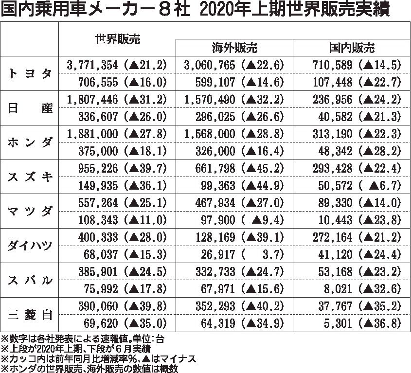 乗用車メーカー8社が30日に発表した2020年上期(1~6月)の世界生産実績の8社合計台数は、前年同期比33・2%減の945万9150台となり、新型コロナウイルスの影響による工場稼働停止や生産調整で1千万台を割り込んだ。上期の減少は2年連...