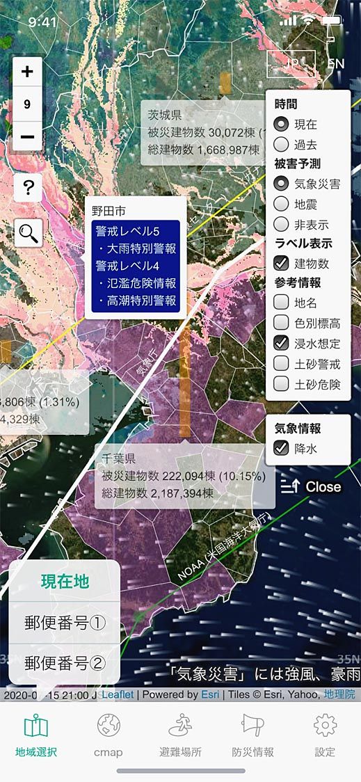 あいおいニッセイ同和損害保険は、災害に関する緊急情報の通知機能などを備えたスマートフォン向けアプリ「被害予測アプリcmap(シーマップ)」を公開した。ウェブサイトの「シーマップdev」とアプリ共通の新機能として、リアルタイム浸水危険度推定情報も追加した。