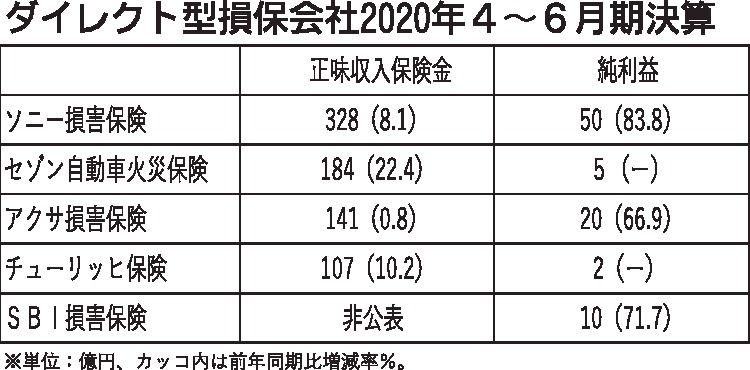 国内のダイレクト損害保険5社の2020年4~6月期決算が出揃い、全社が最終損益で黒字を確保した。1月に実施された保険料の改定、保険契約件数の増加、コロナ禍での外出自粛による正味支払い保険金の減少などが要因となった。 ソニー損害保険は新規契...
