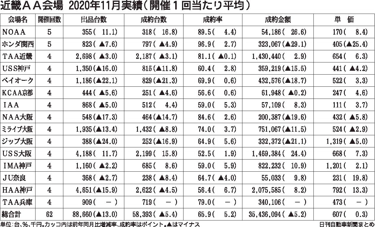 近畿地区にある中古車オークション(AA)15会場の11月実績がまとまった。開催回数は計62回で、前年同月比2回増。出品台数は13・0%減の8万8660台、成約台数は5・4%減の5万8393台と、いずれもマイナスとなった。出品台数が減少する...