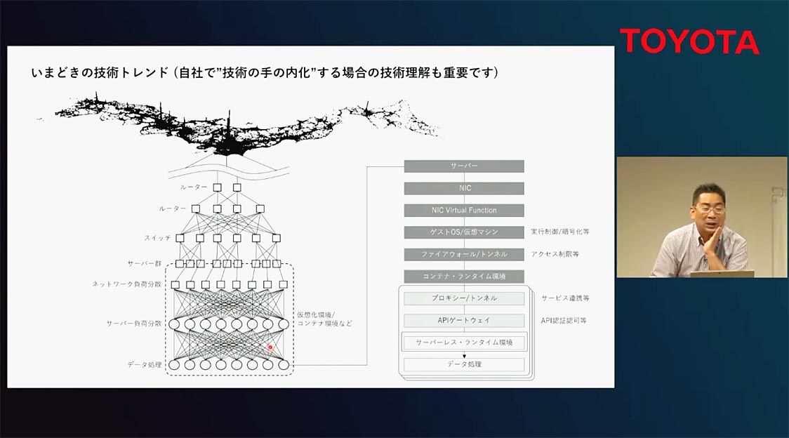 トヨタ自動車は、ソフトウエアエンジニア向けにオンラインイベントを開催した。コネクティッド先行開発部の松本直人主幹が登壇し、自動運転の社会実装に欠かせないシステム・インフラストラクチャー(基盤)に関する課題や今後起こりうるデータフローの変化などについて説明した。同社の先進的な取り組みを紹介し、獲得競争が激しいIT系エンジニアの採用につなげる狙いだ。